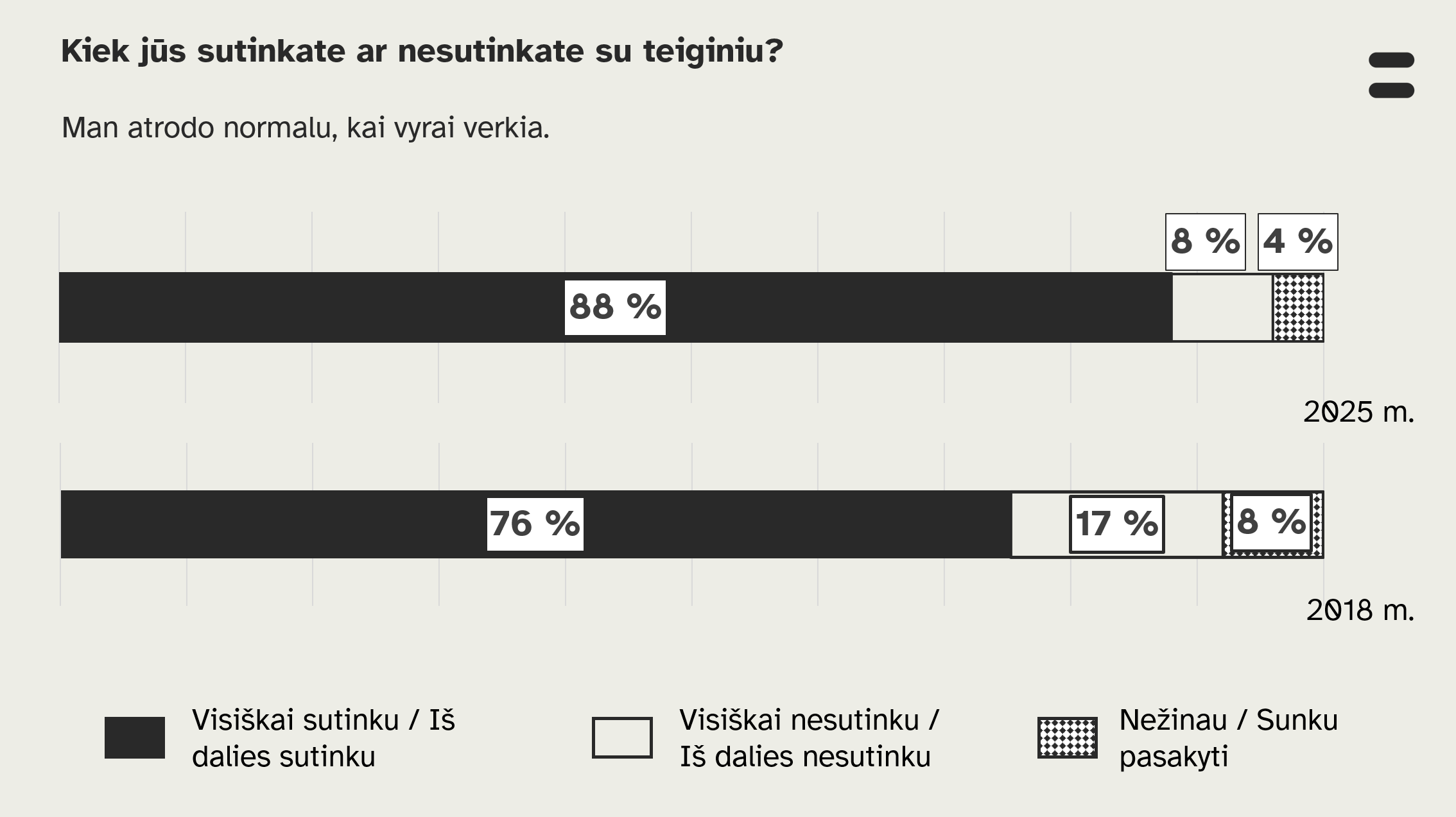 Tyrimo metu buvo paprašyta įvertinti teiginį „man atrodo normalu, kai vyrai verkia“. 2018 m. su juo nesutiko beveik penktadalis (17 proc.) apklaustųjų, o šiemet šis nuošimtis nukrito iki vos 8 proc.