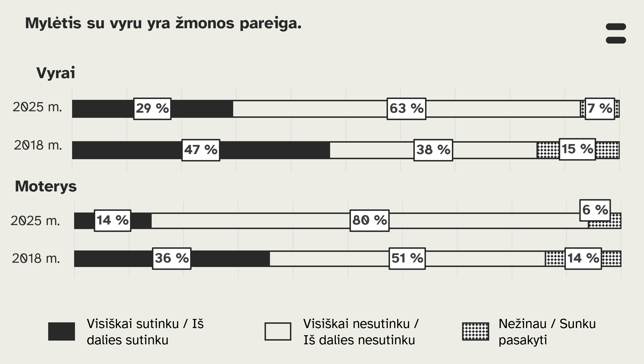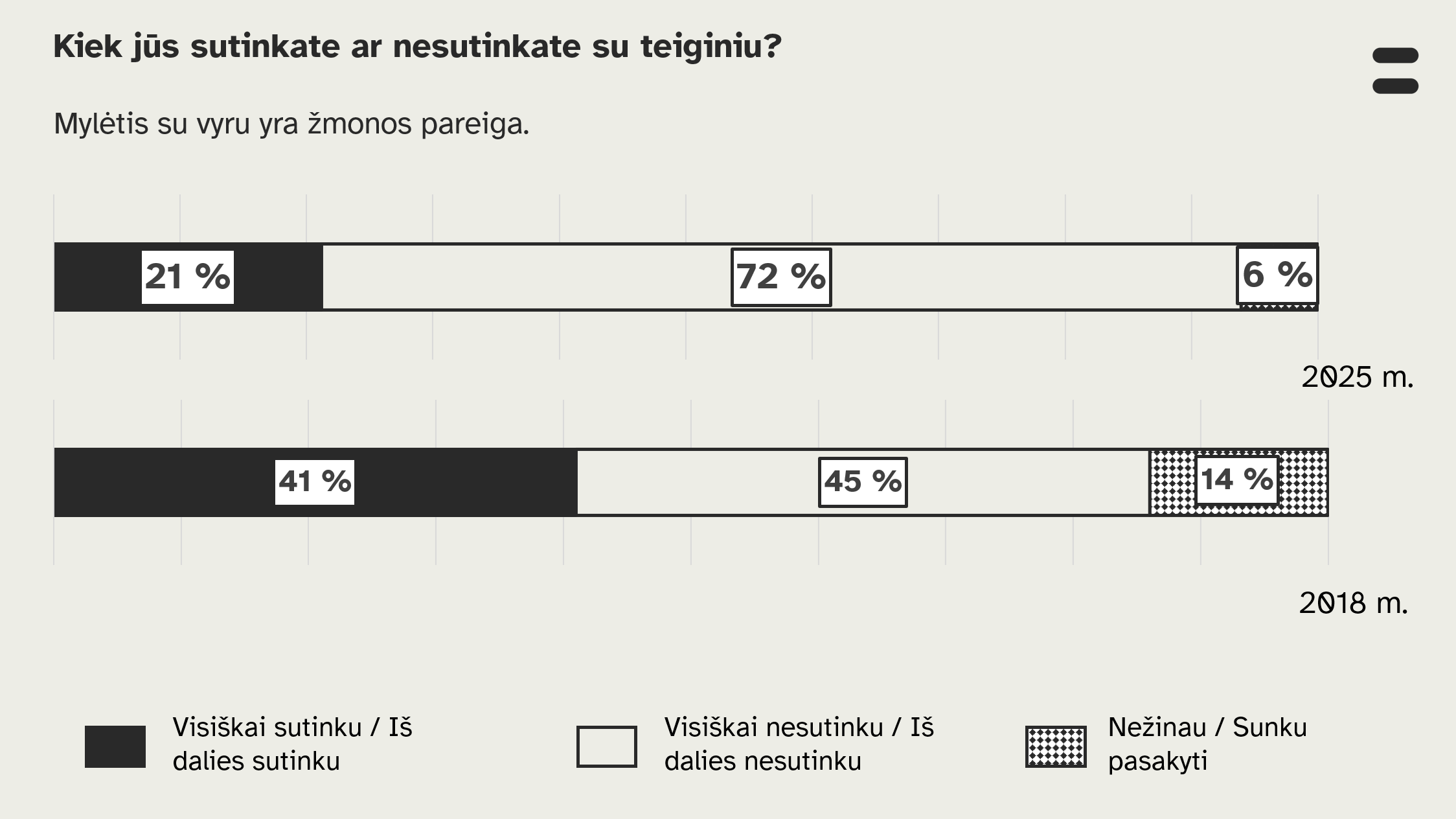 Pasikeitė ir visuomenės nuomonė dėl sekso santuokoje – beveik perpus sumažėjo manančiųjų, kad mylėtis su vyru yra žmonos pareiga. 2018 m. taip galvojo 41 proc., o 2025 m. – 21 proc. apklausos dalyvių.